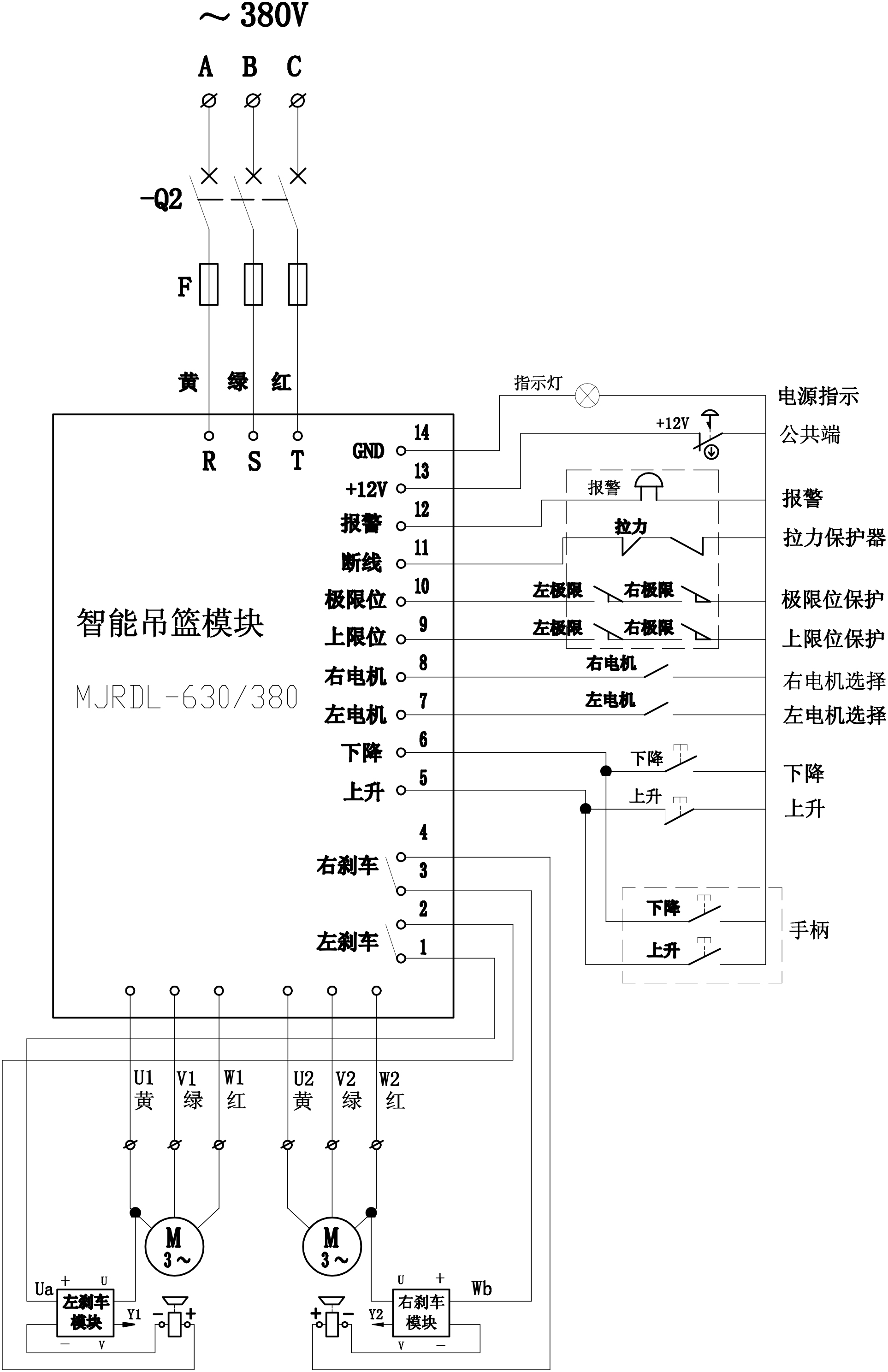 2、萬能轉(zhuǎn)換開關(guān):用于對電動(dòng)吊籃控制模塊輸出的U、V電源與左、右電機(jī)進(jìn)行切換,分別控制左電機(jī)接通、右電機(jī)接通或兩電機(jī)同時(shí)接通。